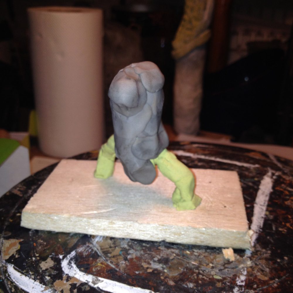 Probing the wires into his body I also started to work in wrinkles and scars around his arms and the rolls of fat on his belly. Sculpey firm is rapidly becoming my weapon of choice as it hold details well. I’ve still got plenty of normal pink sculpey but I may end up cutting it with the firm to make it better to work with.